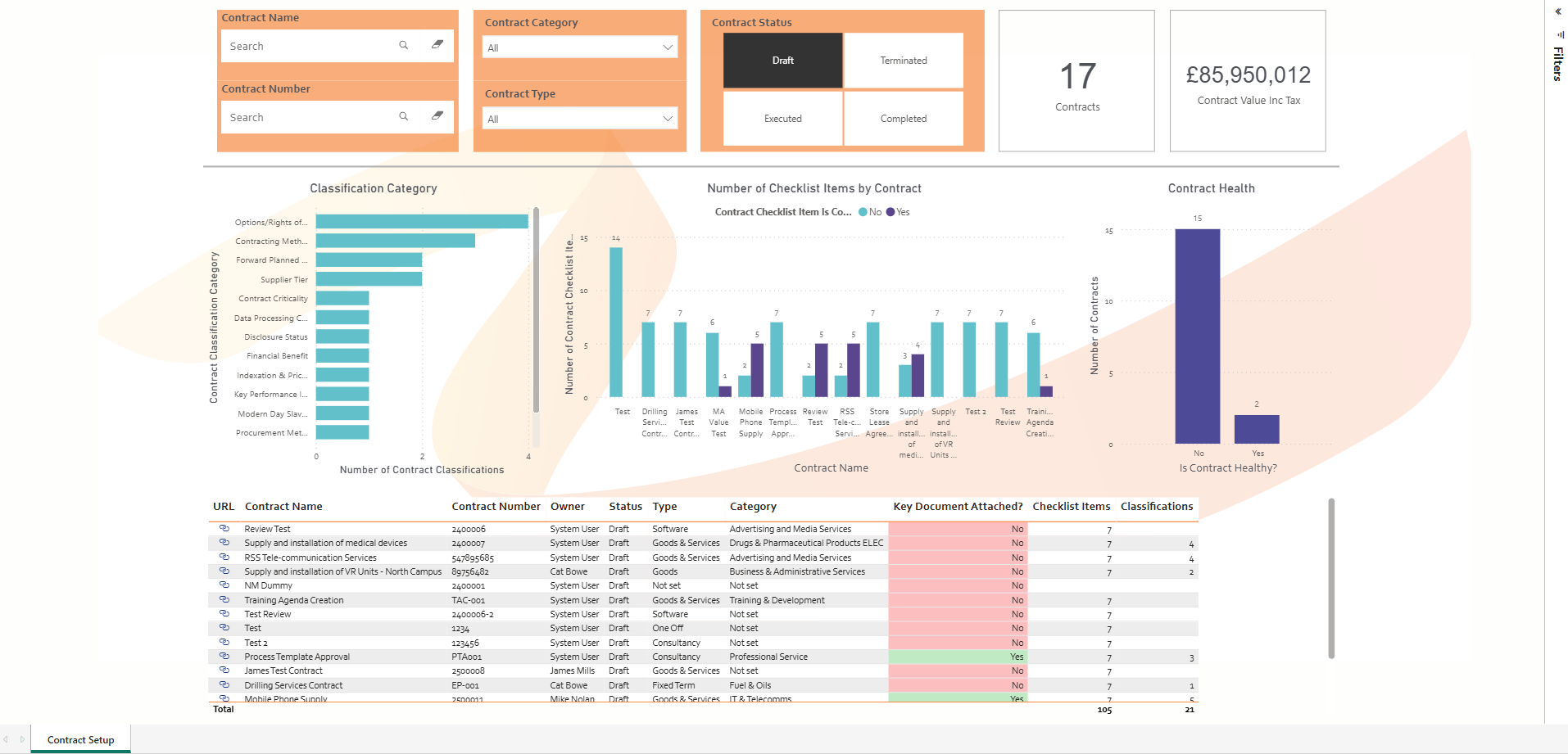 This dashboard enables you to clearly see how many set up actions are still outstanding as well as filter the data in order to action the priority contracts first.