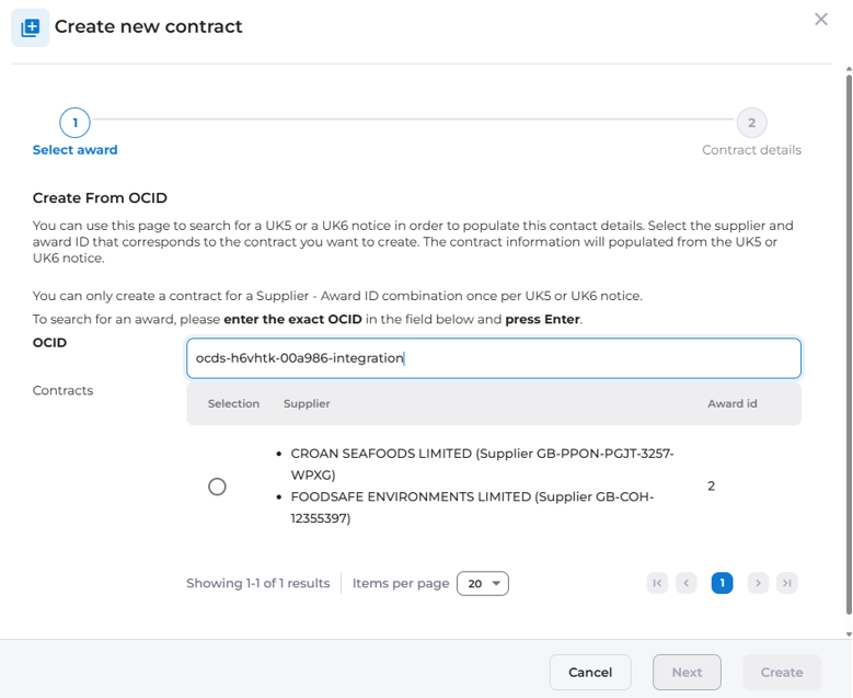 - Creation of Contract Records and Supplier Records based of previous notices