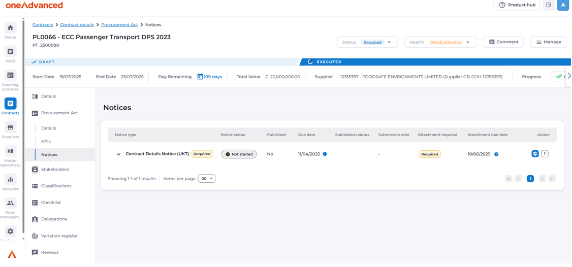 The first component of the Source to Contract Procurement Act solution is included in this release. This feature is intended to operate alongside any existing tendering tools your organisation may have to allow you to undertake the elements of Contract Lifecycle management that the Procurement Act expects of contract managers.
