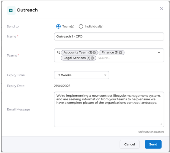 System administrators can set up a process which will send an e-mail to members of all teams, or specified teams, which will contain a link to a contract creation form.
