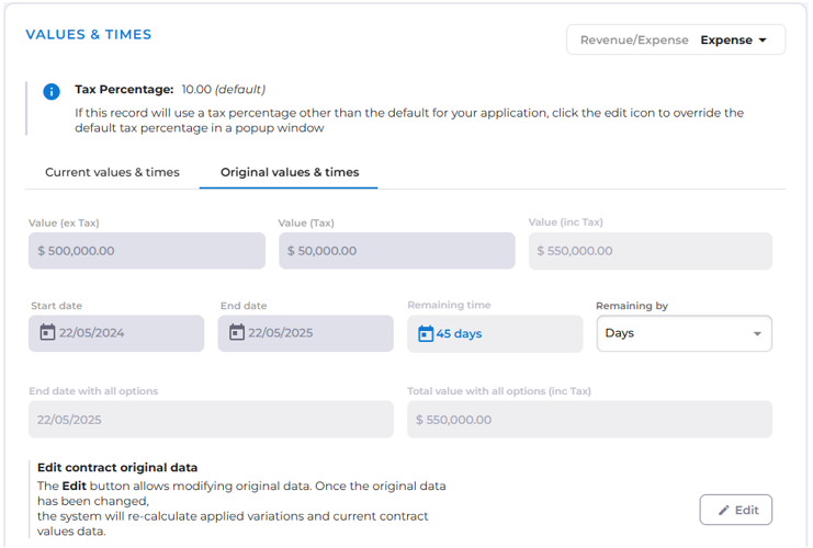System administrators can edit the original values of a contract using a new dialogue box.