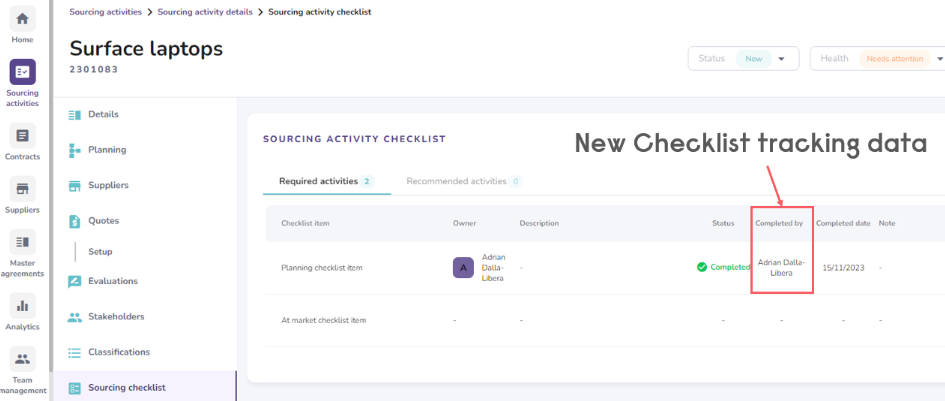 This release displays a ‘Completed by’ field to Checklists in both sourcing activities and contracts. The field will autogenerate the user's name that clicks the ‘Completed’ Action button. It cannot be edited manually.