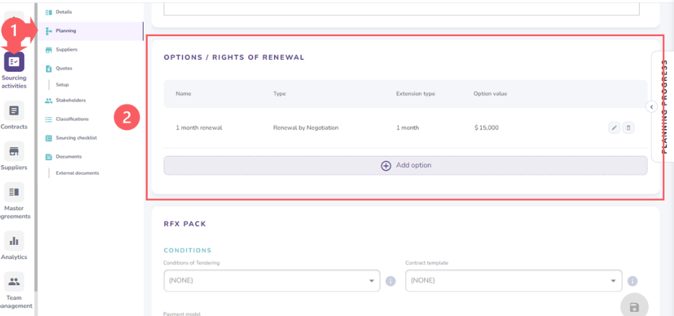 An ‘Options/Rights of Renewal’ Section has now been included as part of the ‘Planning’ phase of a sourcing activity.