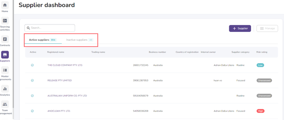 This release now displays Active and Inactive suppliers via respective tabs on the Supplier dashboard.