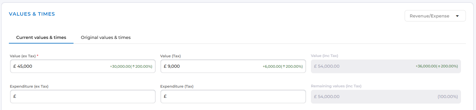 After approval is granted and the variation is applied, the updated contract values will appear in the Details tab under the Current Values & Times section. This section highlights any value increases the contract has undergone and also includes a tab displaying the Original Values & Times for reference.