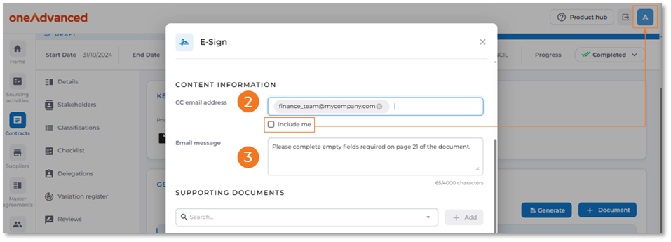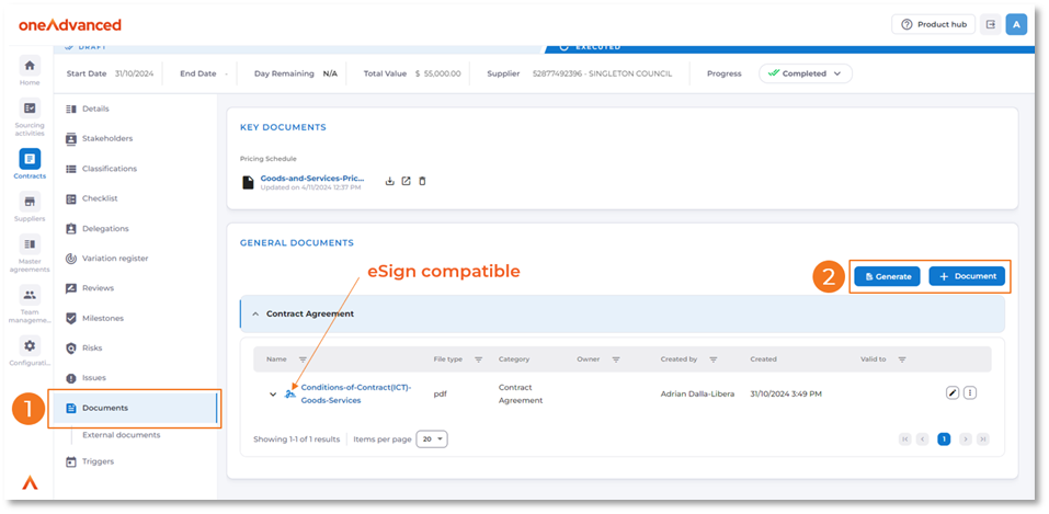 Users with the ‘eSign’ role can request signatures for documents in the ‘General Documents’ section of sourcing activities and contracts.