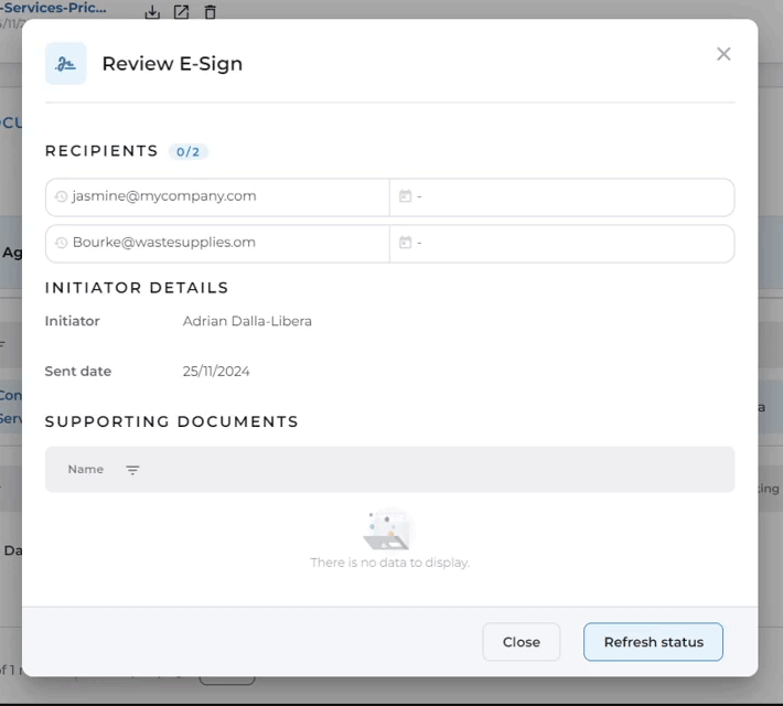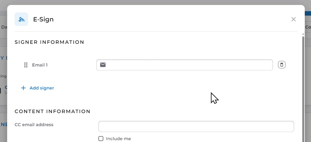 After clicking ‘Setup E-sign’, the E-sign popup window will appear. This window allows you to add signers and additional recipients, customize the message, and attach any associated documents.