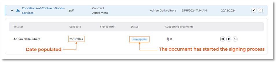 Once the authoring is complete, the document’s status changes to ‘In progress’ and it will be sent to the signers in sequential order for completion. The sent date field will be date stamped, to indicate when the document was sent for the first signature.