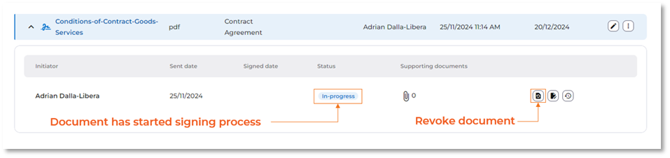 After the document has been sent but before signing is completed, the initiator can revoke it by clicking the ‘Revoke document’ button. Justification for revoking is required to complete this process, and signers will be notified of the document’s revocation and the reason behind it. The document’s status will then change to ‘Revoked’.