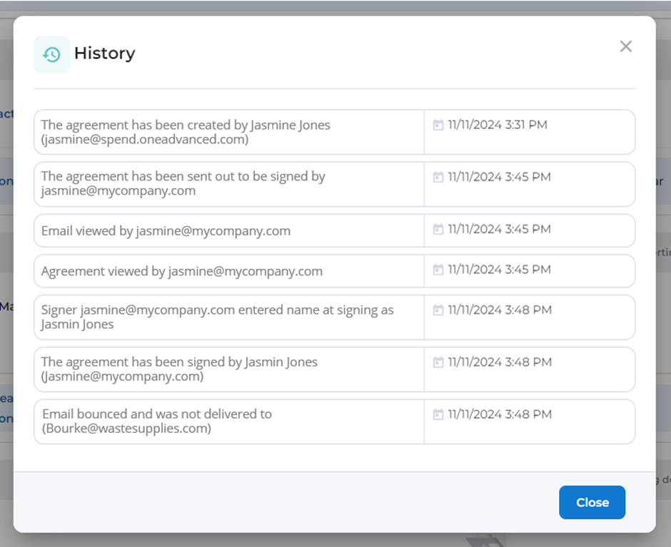 The history will not only include timestamps for when a signer completed their task but will also provide detailed information such as when emails are read, documents are viewed, details are entered, and even any failures that occur.