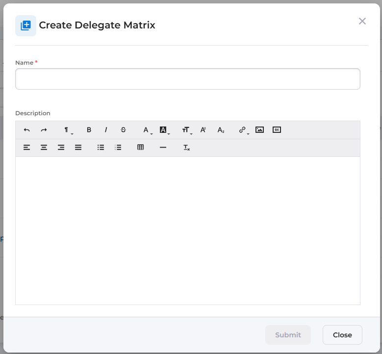 Select the + Matrix button, enter a name for the new matrix and select submit. Adding a description is an available option but is not mandatory.