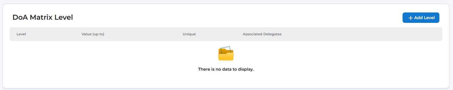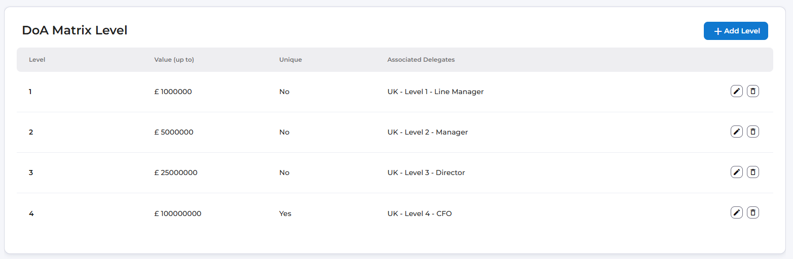 Select the Matrix you have created and scroll to the DoA Matrix Level section. This is where you will define the financial range that requires an action and the role from which that action can be assigned.