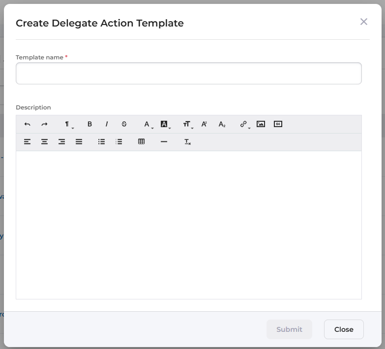 Navigate to the Templates tab within the Delegate Actions section and select the + Template button.