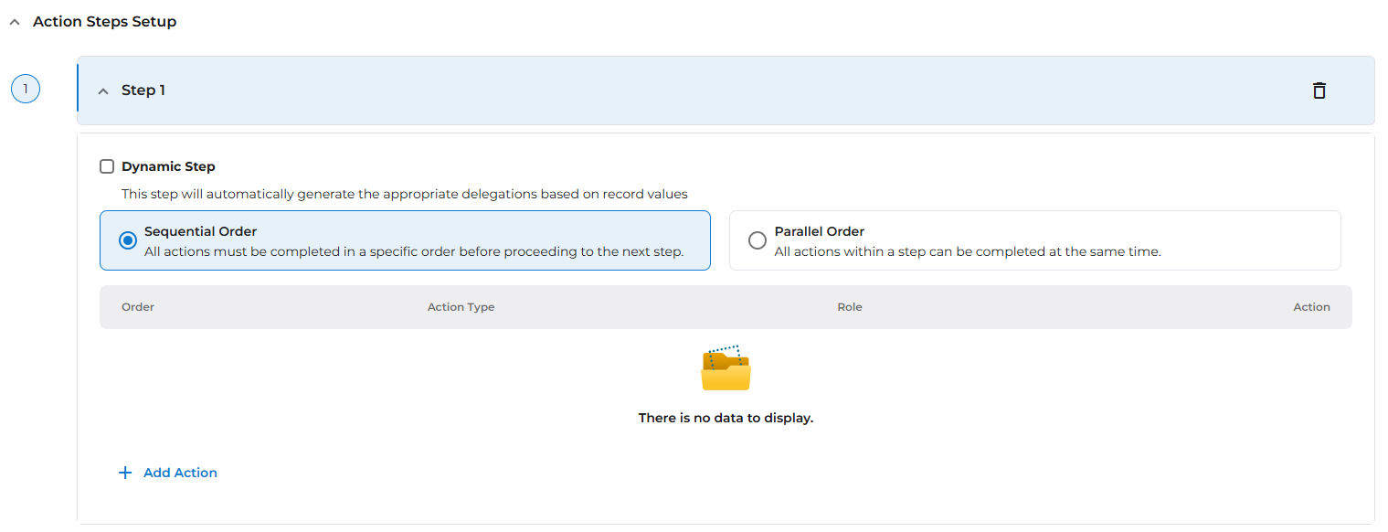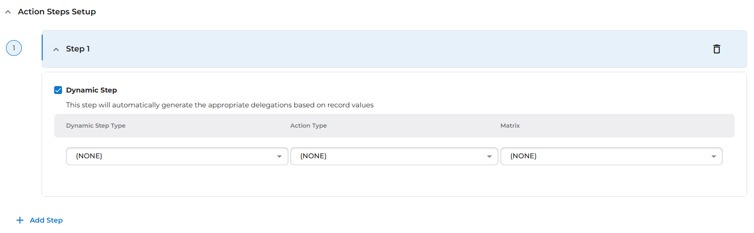 You can either add this as usual by following the standard process for delegate actions, or you can identify this step as a dynamic step using the checkbox. If you choose the latter, the actions required for that step will be determined by the DoA matrix you've just configured.