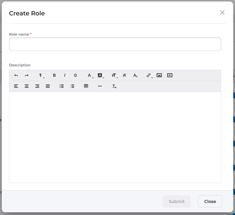 Select the + Role button, enter a name for the new role (Adding a description is an available option but is not mandatory) and select submit.