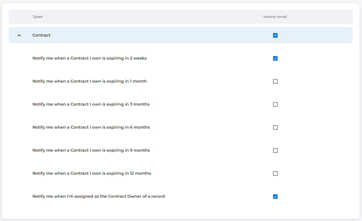Selecting Notification Preferences allows users to decide the intervals at which they will be notified about certain aspects of the records they own. For example, when a contract is expiring, a user can determine if they should be emailed 12 months, 9 months, 6 months, 3 months, 1 month and/or 2 weeks before its expiry date. There is also an option of whether the user should be notified when assigned as the owner of a contract.