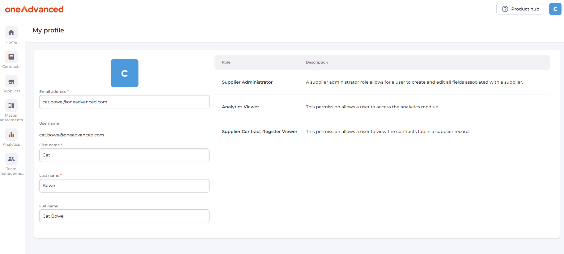 When selecting your profile, your user record will be displayed and some details, such as email address and name, can be amended if required. Your user role(s) will also be displayed and can be viewed from this screen, however they cannot be modified. User roles can only be edited or assigned by System Administrators in the User Management section of the system's configuration.