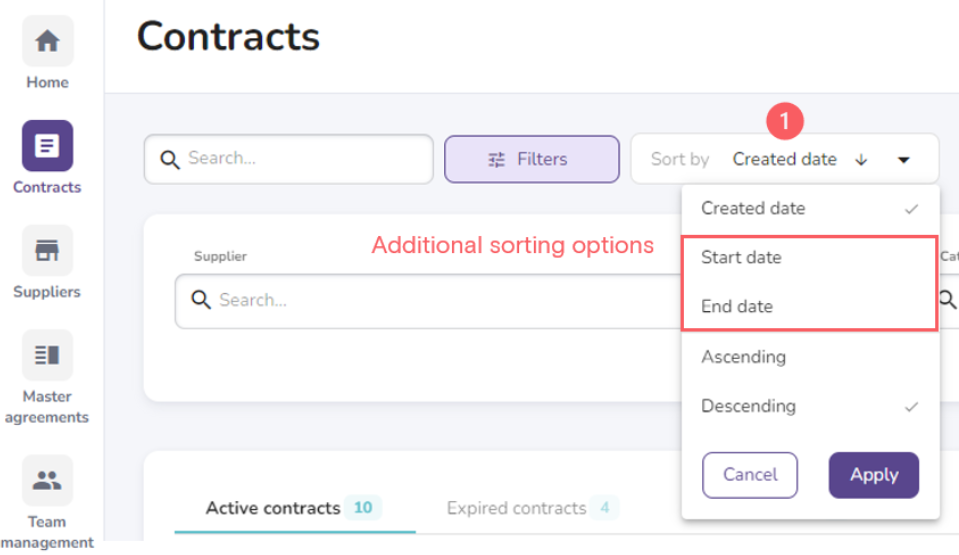 This release adds two additional sorting options for contracts in the Contract dashboard. Either ascending or descending sorting of contracts can be carried out for 'Contract Start date' and 'Contract End date'.