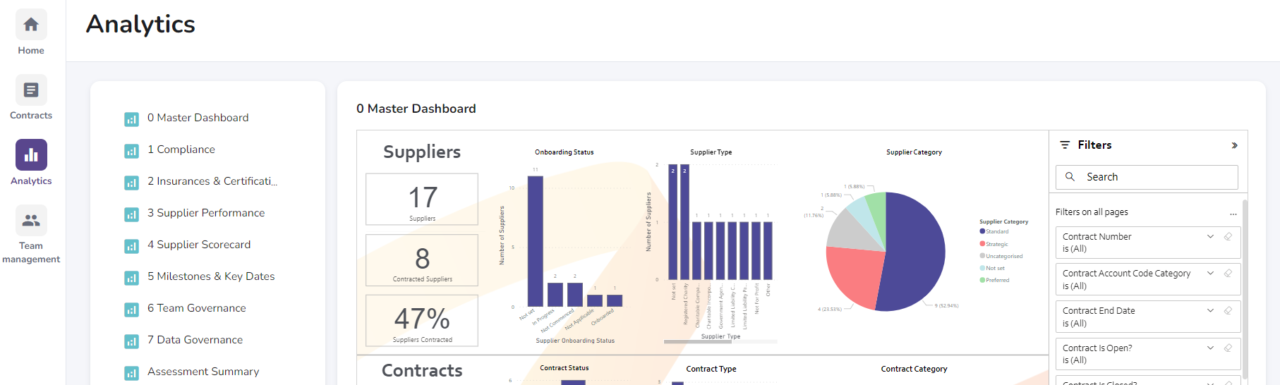 Analytics Viewer | This permission allows a user to be able to access the Analytics module and view analytics dashboards. IMPORTANT: Analytics dashboards may reveal information about Suppliers, Agreements, and Contracts if the user doesn’t already have access to this data. |