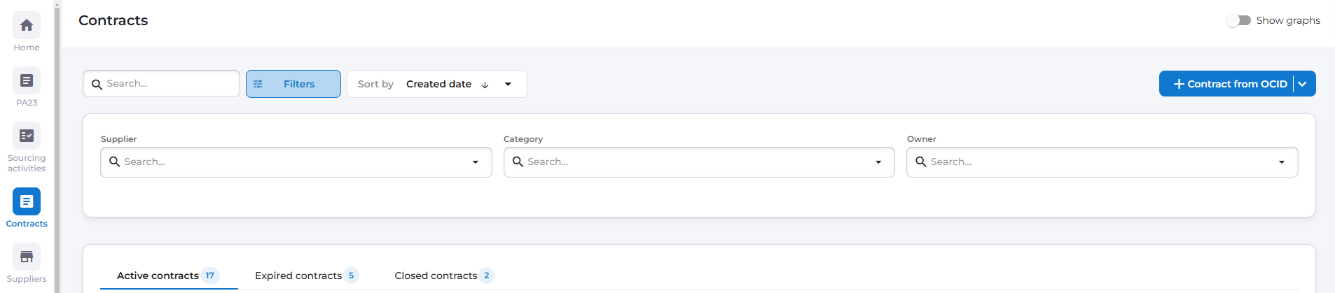 The Contracts module is accessed via the navigation panel on the left side of the screen.