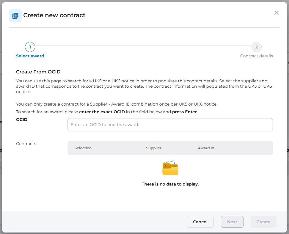 When selecting the Create Contract button from the Home page, if you have Procurement Act features enabled in your site, the default creation option will be Create from OCID, as opposed to the standard creation wizards that are unrelated to the Procurement Act.