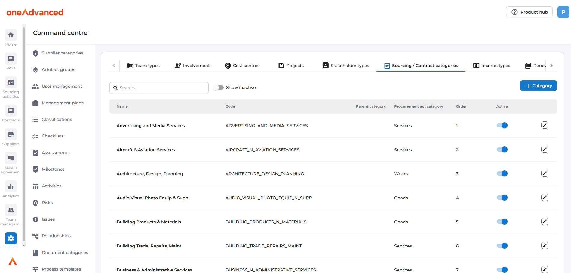 Within the Categories tab of the Core Data section in the Configuration module, you can now assign Procurement Act categories (I.e. Works, Goods and/or Services) to the categories configured for contracts in your system.