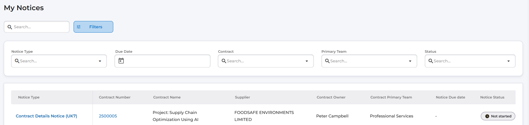 Each entry within the view's table has links to the Notice and to the contract record, as well as reporting on the status of the notice.