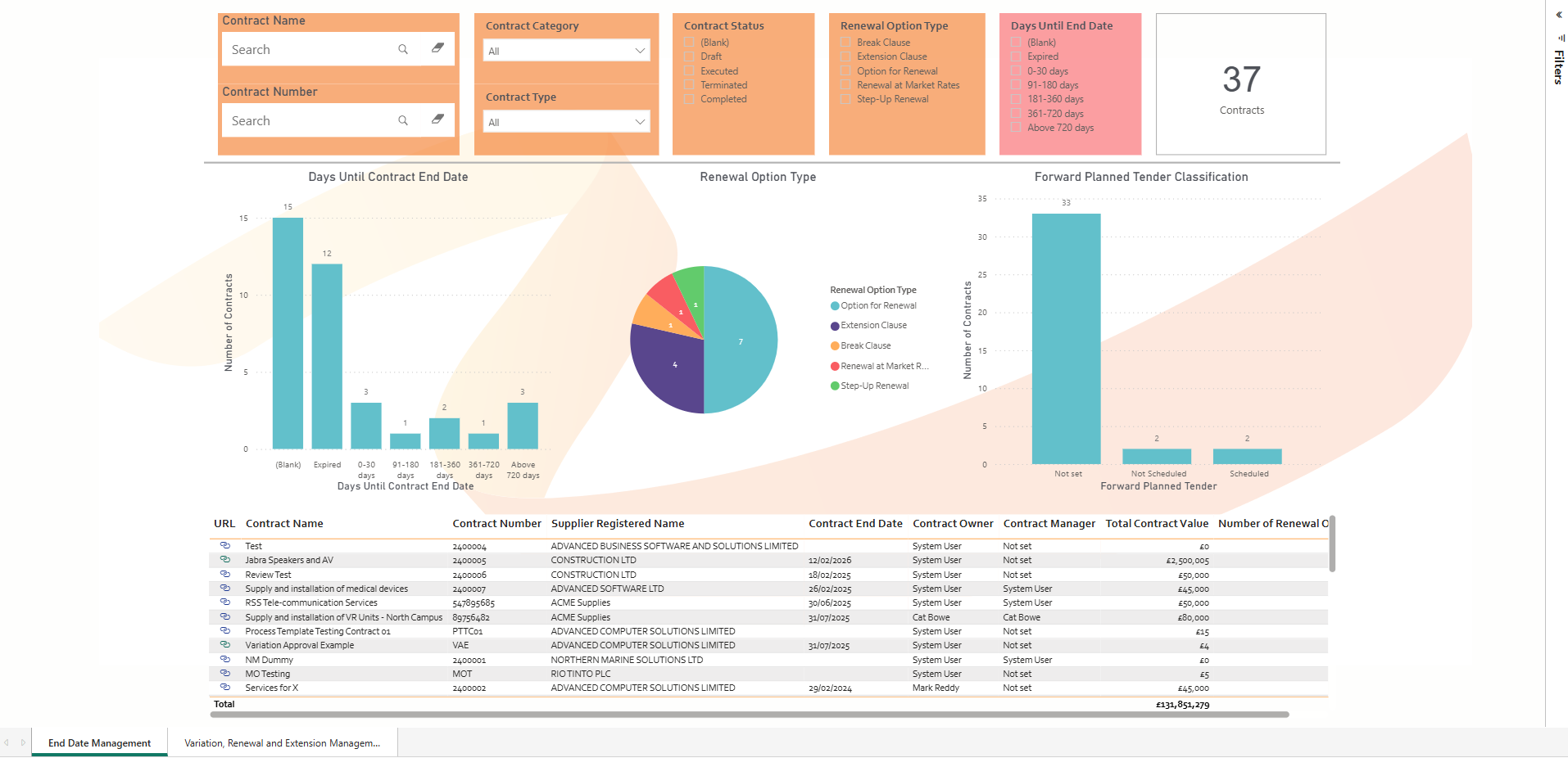 Users can see the number and proportion of contracts with different renewal options across their supplier base, and explore contracts that may have unfavourable terms.