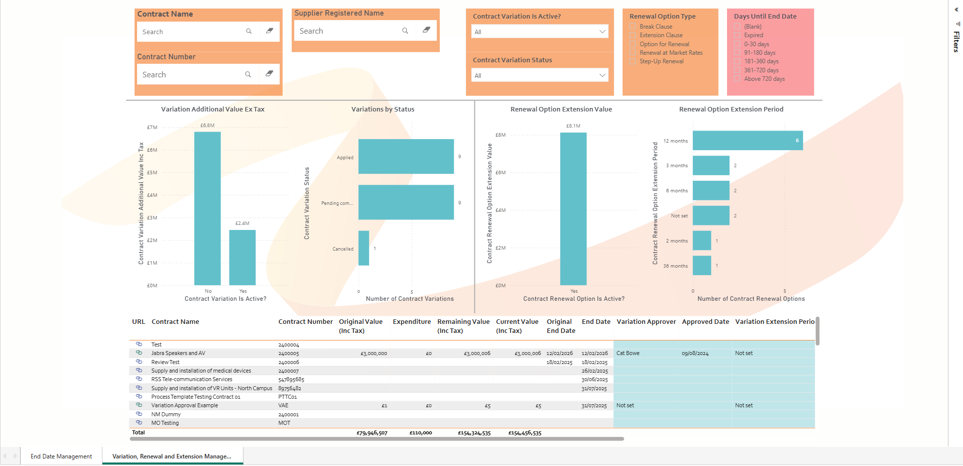 It also offers insights into the number of created Variations that have been applied, and highlights those that are still pending application or approval. If the user filters the view to specific contract records, it will reveal how closely the contract's lifecycle aligns with the original plan, based on whether Variations or Extensions were necessary to meet the business objectives.