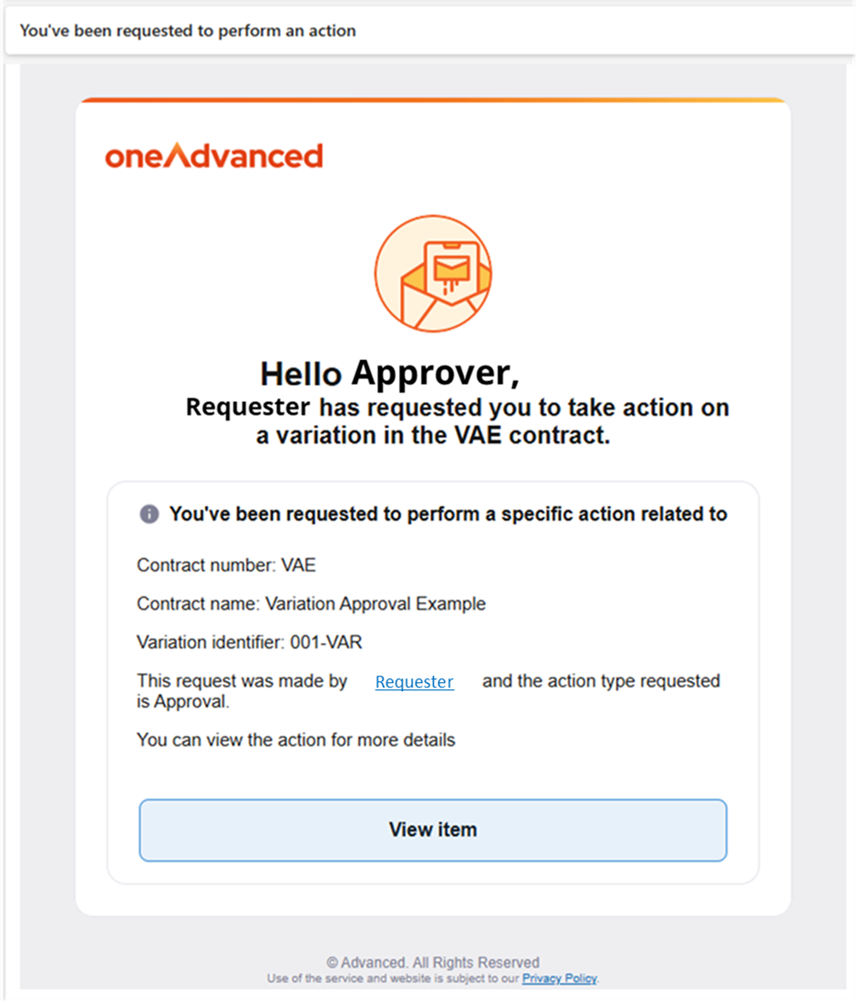 After a variation approval request is submitted, the selected approver will receive an email notification prompting them to take action on the contract.