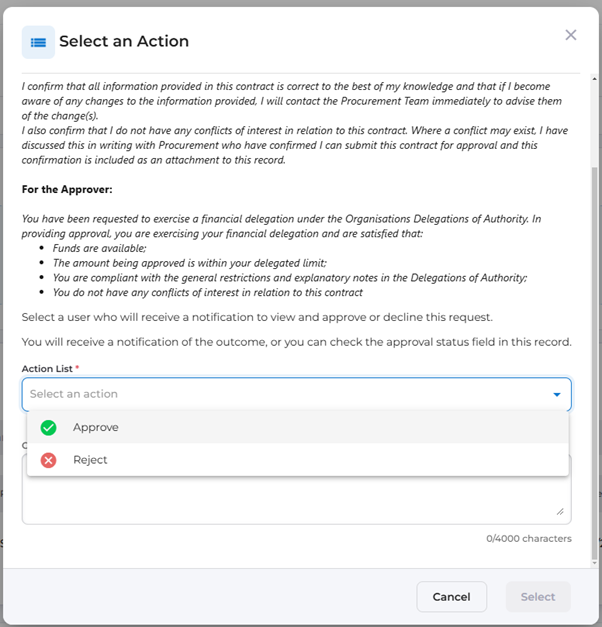 This window contains a dropdown to complete the action with the options that were configured in Delegate Actions (In this example, they can approve or reject the request).