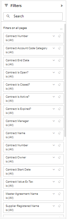 On the right hand side of the page you will see the filter pane. This can be opened or minimised and allows you to filter the data being reported on within the dashboard. The filters are broken down into fields from the system allowing you to filter by specific data, such as suppliers with a specific Supplier Type (For example).