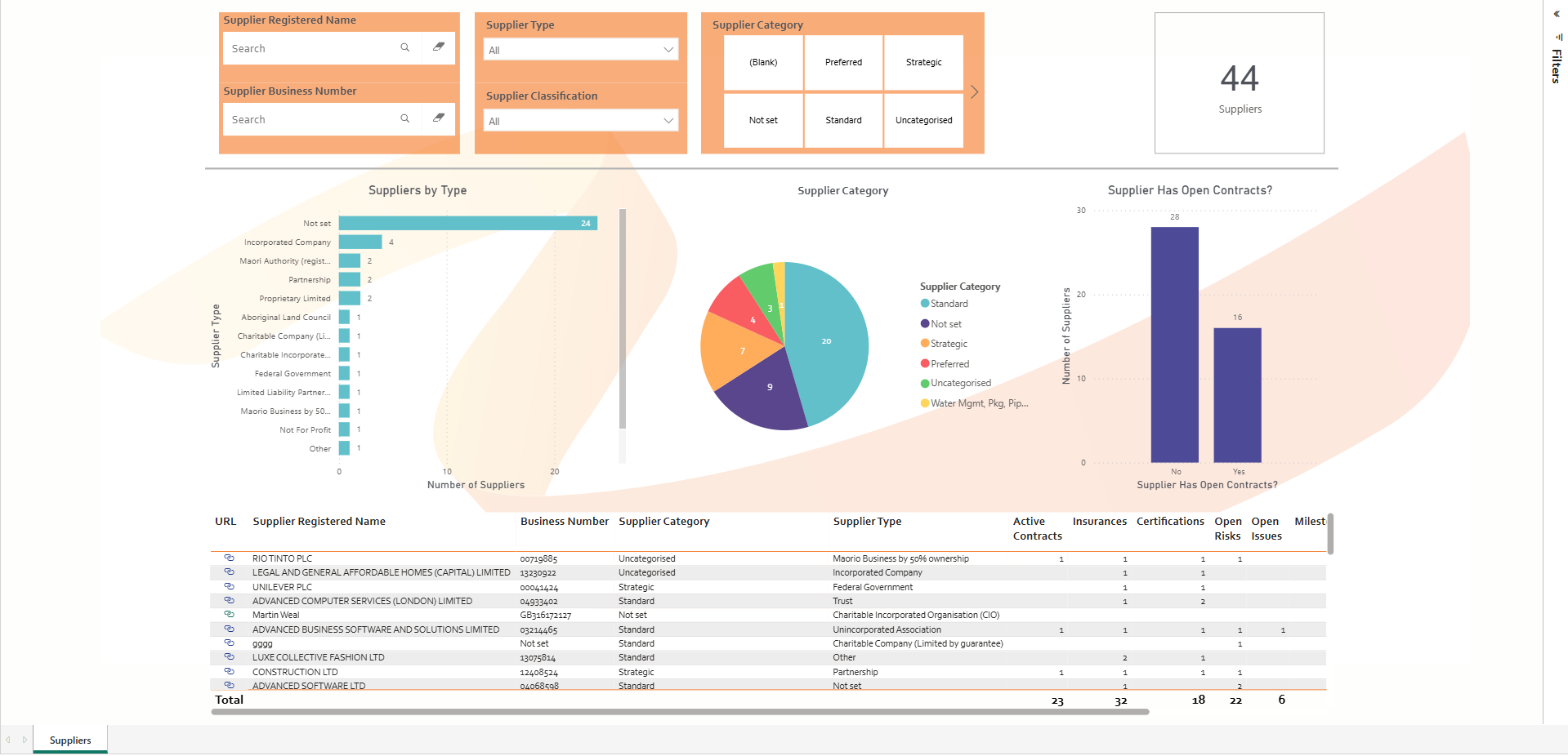 Once your supplier records have been fully populated and contain all the relevant and necessary data, you will be able to effectively utilise the Suppliers dashboard in the Analytics module to gain insights into your supplier base.