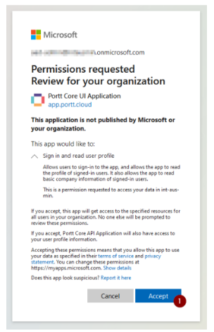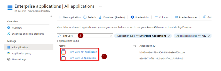 Note if your tenant has a large number of applications listed already, you can use the search bar to filter down to our apps (beginning with “Portt Core” as shown in #2)