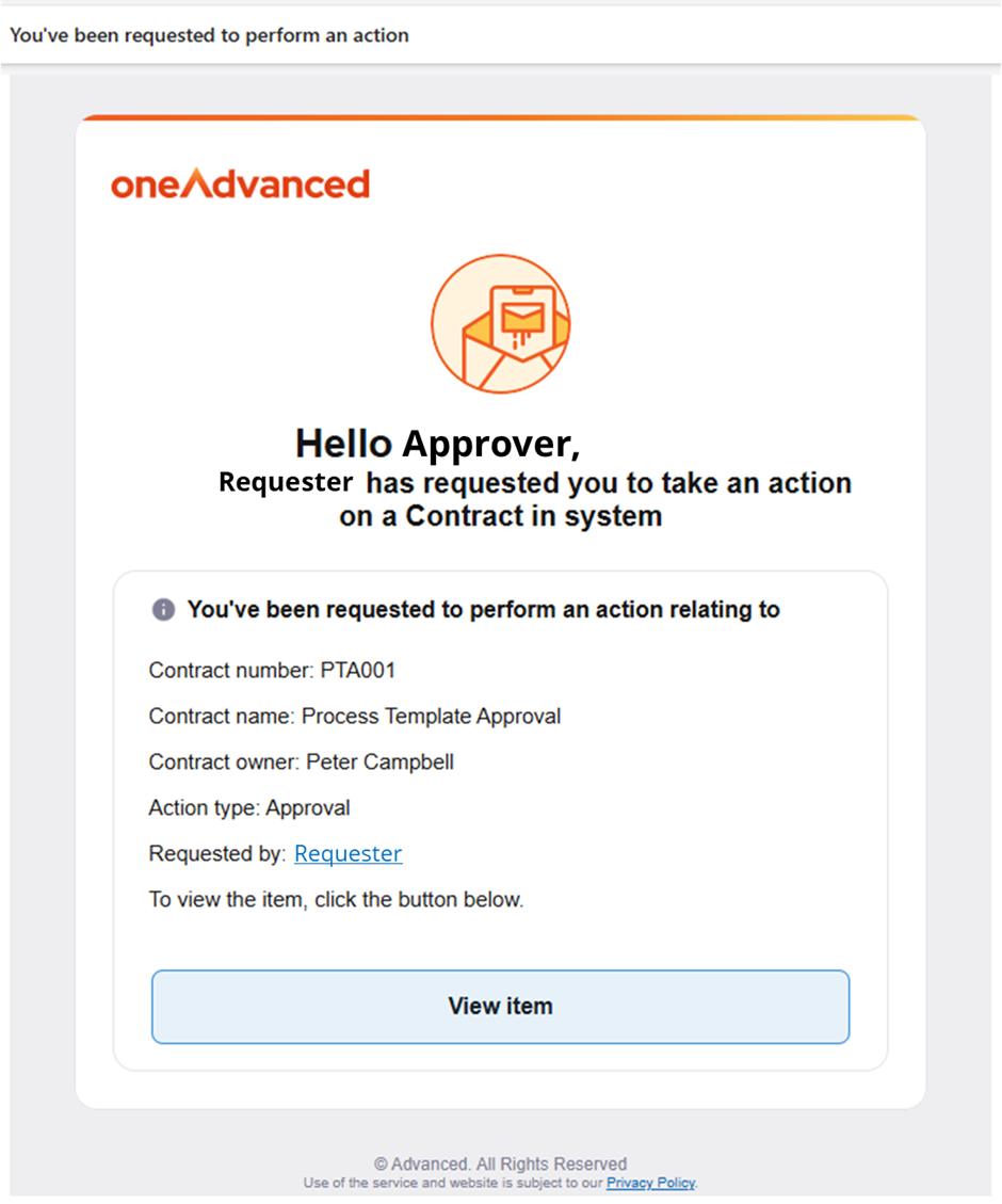 After a stage approval request is submitted, the selected approver will receive an email notification prompting them to take action on the contract.