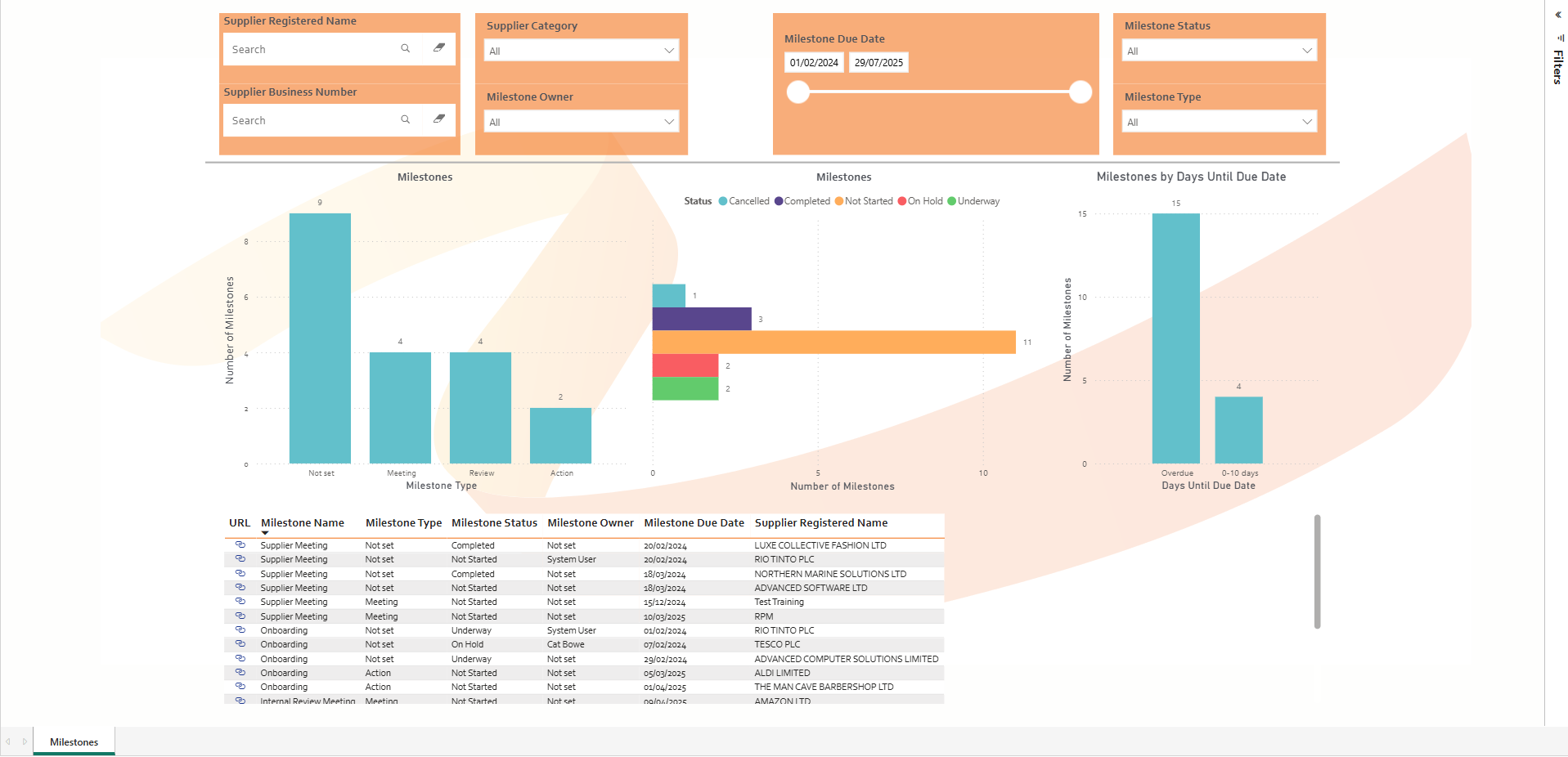 In summary, this dashboard enables users to centrally view all milestones across the entire supplier dataset or a refined subset, eliminating the need to navigate through individual records one supplier at a time.