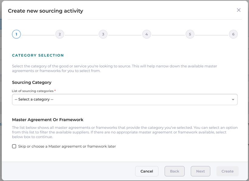 Select the button to add a new record and a six-step wizard will be displayed which will guide you through the process of creating a new sourcing activity.