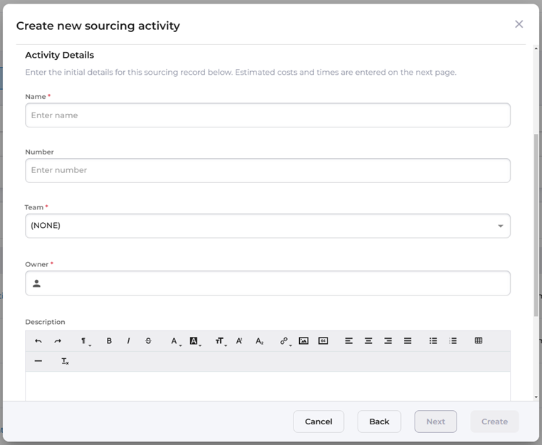 Populate the high-level details for the sourcing activity such as Name, Number, Team, Owner and Description.