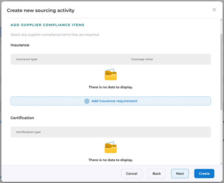 As with the Contract Management module, Documents, Insurances and Certifications for suppliers cannot be uploaded via the Sourcing Activity record. Instead, here you are defining the requirement for these items as part of the activity.