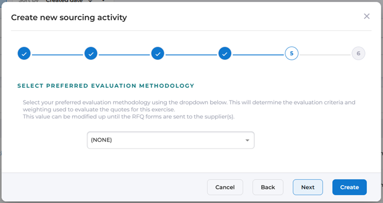 Choose the Evaluation Methodology you wish to use when assessing Suppliers’ responses for this Sourcing Activity. The options available in the dropdown are predefined by the system configuration.