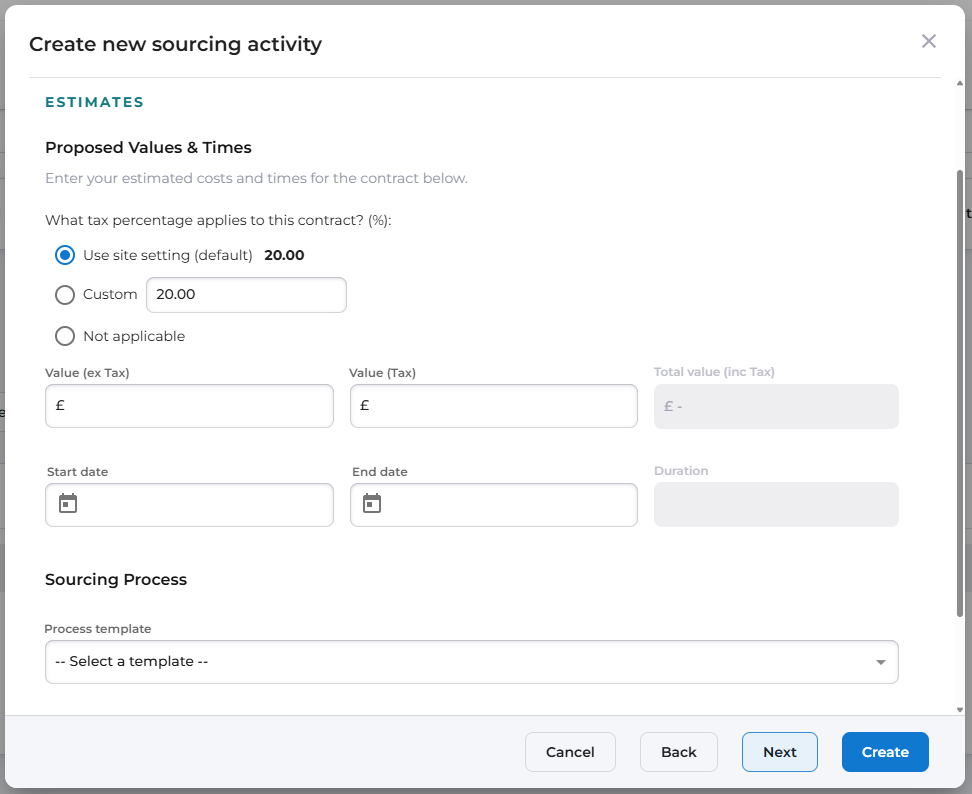 If the tax percentage for this Sourcing Activity is different to the site setting default percentage, select Custom and enter the estimate tax percentage that will apply to the awarded contract(s) for this Sourcing Activity.