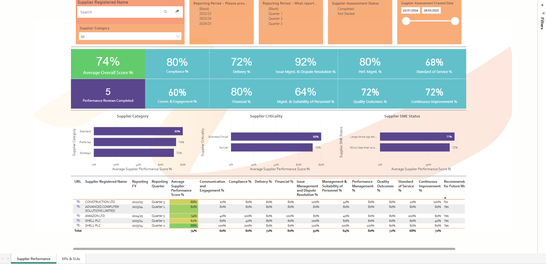 To use this dashboard, start by filtering for the specific supplier whose performance you wish to review, then select the relevant assessment for the KPI or SLA. This will update the visualisations and number tiles and allow the user to see the performance levels of the supplier against the target that was set.