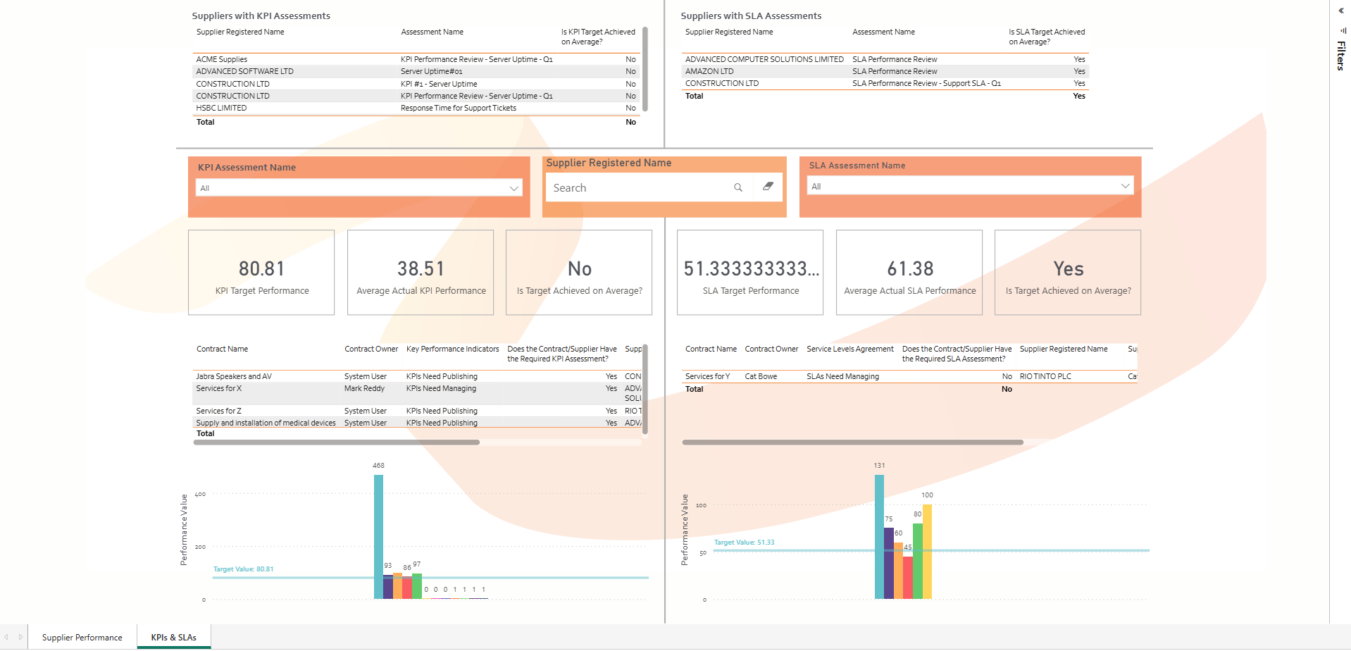 This dashboard allows the user to review supplier performance against their targeted KPIs and SLAs, with the left half of the page centred around KPIs, and the right half centred around SLAs.