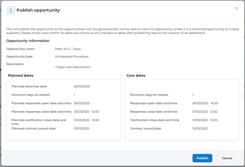 Selecting the Publish opportunity button creates this wizard to confirm the details before confirming publication: