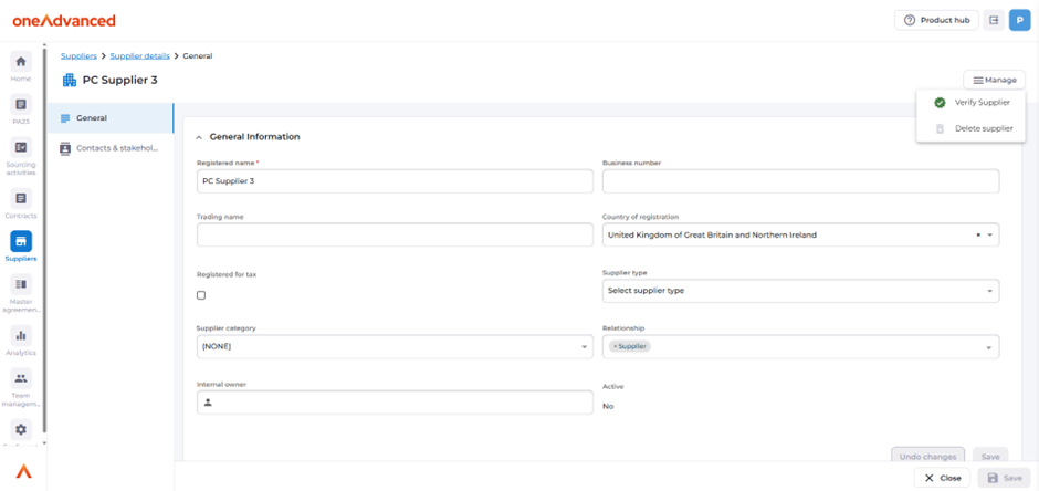 The record is only made up of a general tab and a Contacts & Stakeholders tab before the supplier has been verified.