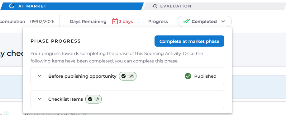 Once the opportunity has been published, two additional tabs are created under Opportunity for the Sourcing Activity: