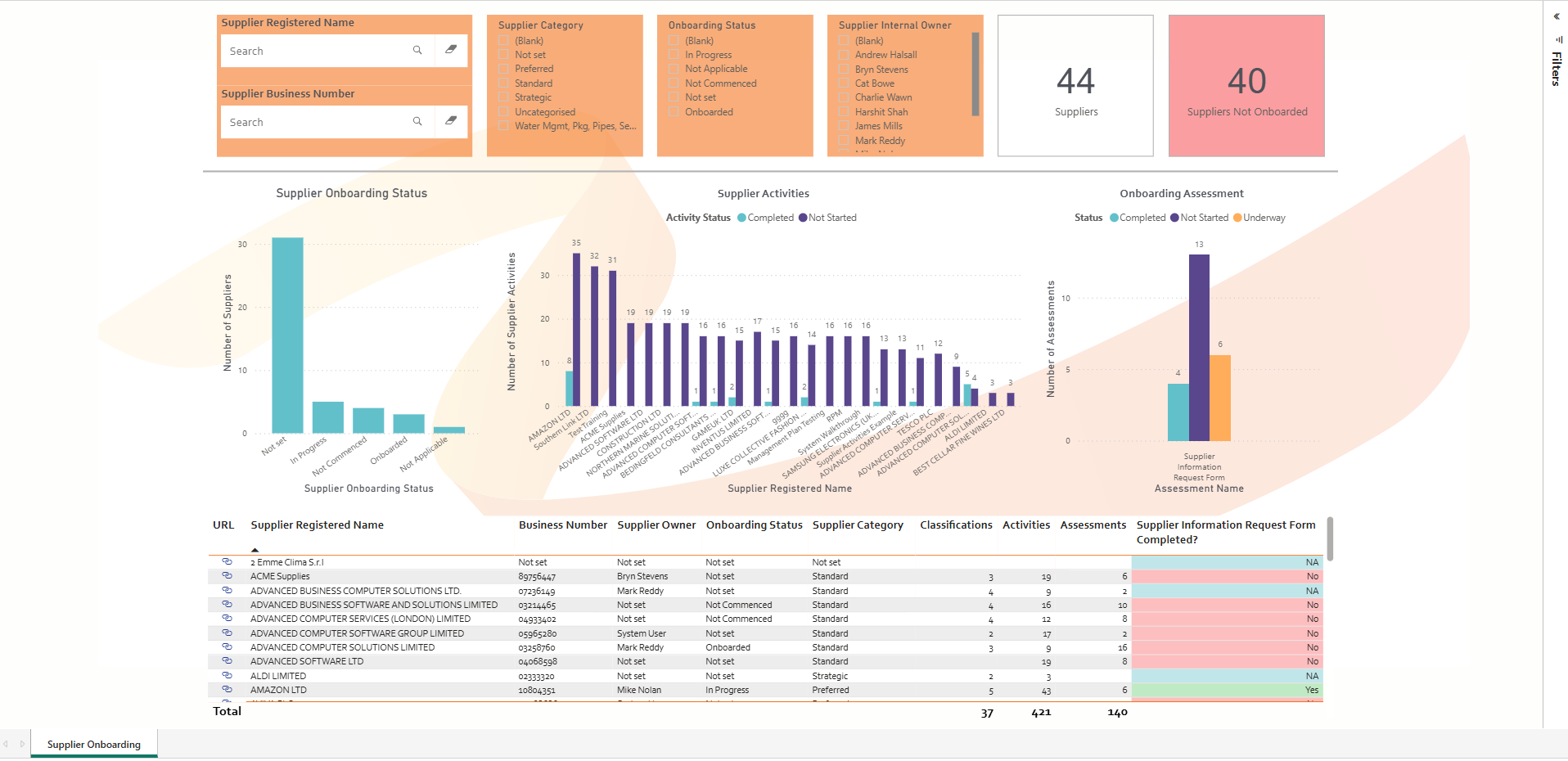The data showcased reflects key aspects of a supplier’s onboarding process, such as activities (from management plans) and assessments, as well as their reported onboarding status in the system.