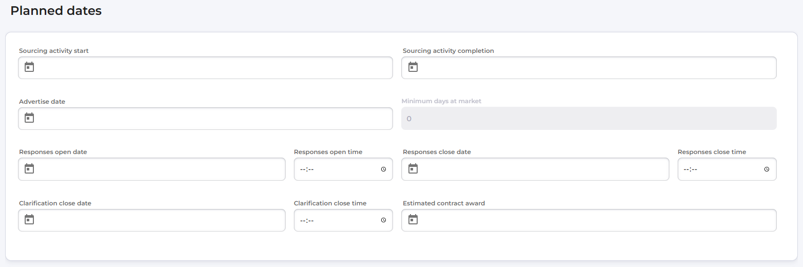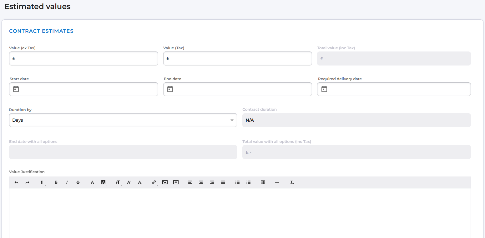 After Contract Estimates, further sections are available where you can provide additional information about the requirements of the sourcing activity and the contracts that will be created as a result of it.