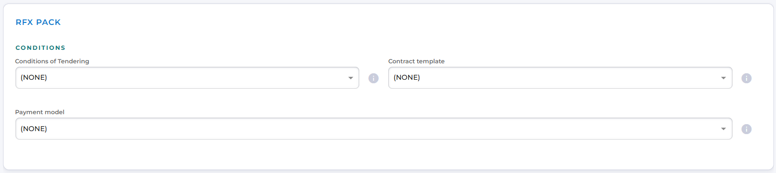 The RFx Pack section enables you to define the conditions of your RFx pack - including the Conditions of Tendering, Contract Template and Payment Model.