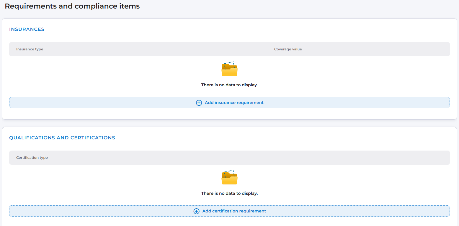 These requirements may include Insurances, Qualifications and Certifications, and Documents.